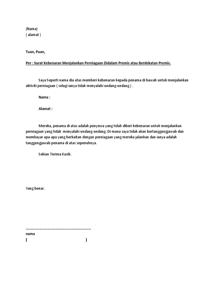 Contoh Surat Kebenaran Menggunakan Premis Perniagaan Feerpons